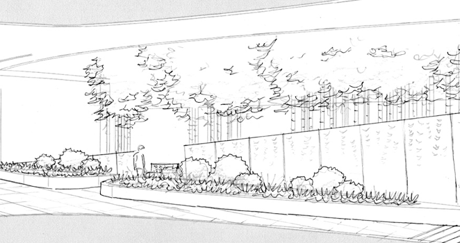 Secluded behind street front retail space the lobby is both forecourt to the commercial tenancy and gateway to the residential apartments above. The access walkway carves through podium planters in a sweeping gesture that transitions the geometry of the building facade to the ground plane. Bamboo planting offers a vegetative buffer to the north while maintaining solar access through soft foliage.